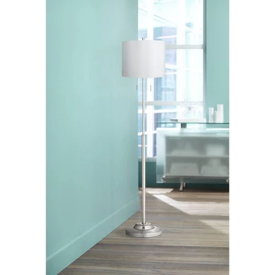 Update your living space with the help of this brushed nickel finish floor lamp. The design is crafted from metal, and has a chic contemporary look that’s paired with a beautiful white hardback drum shade. It comes with twin pull chains that rev up the style factor and make it easy to control the light output.