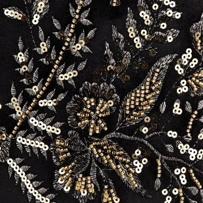 - Black velvet fabric with gold embroidered floral pattern hardback drum shade.