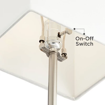 From the 360 Lighting brand, this set of two brushed nickel table lamps is a striking choice for a contemporary setting. Each lamp features a slender profile with a square base and a satiny silver-tone finish. Square shades in crisp white complete the look. In the base of each lamp is a built-in USB port, perfect for keeping personal handheld electronics charged and ready.