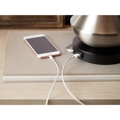 Charge a phone or small electronic device easily with the Simon table lamp set. The two matching table lamps feature a sleek modern design in a brushed nickel finish. The built-in USB port in each lamp allows you to easily keep your phones and electronic devices charged up and close at hand. Up top are Empire profile white fabric tapered lamp shades. A great design for use in a bedroom, on an end table, or in a home office.