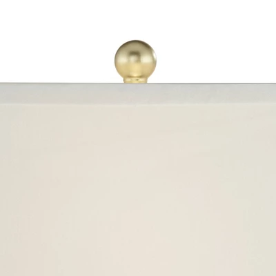 - White rectangular lamp shades with gold finish metal ball finials. 8-foot long brown cords.